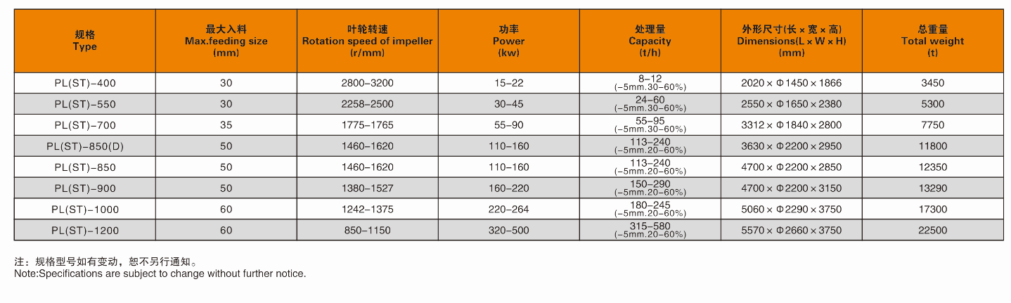 2. 同一规格破碎机可根据标准规定的处理置范围,安装不同的装机功率满足不同的需要。